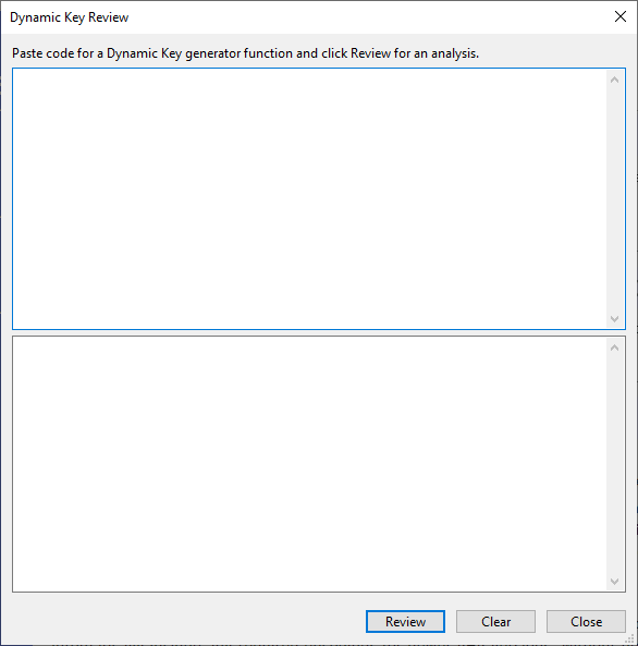 Paste the PHP code for one of your dynamic key functions into the upper text box, then click Review. After a few seconds the dialog will give a critique. The analysis identifies sources of data used by the function, and guides you to improve the function if necessary by making use exclusively of data that is available at runtime rather than hardcoded literal values. After a successful analysis, output will be similar to the screenshot below. Any errors will be shown instead. This example also illustrates the use of names that do not suggest a relation to key generation.